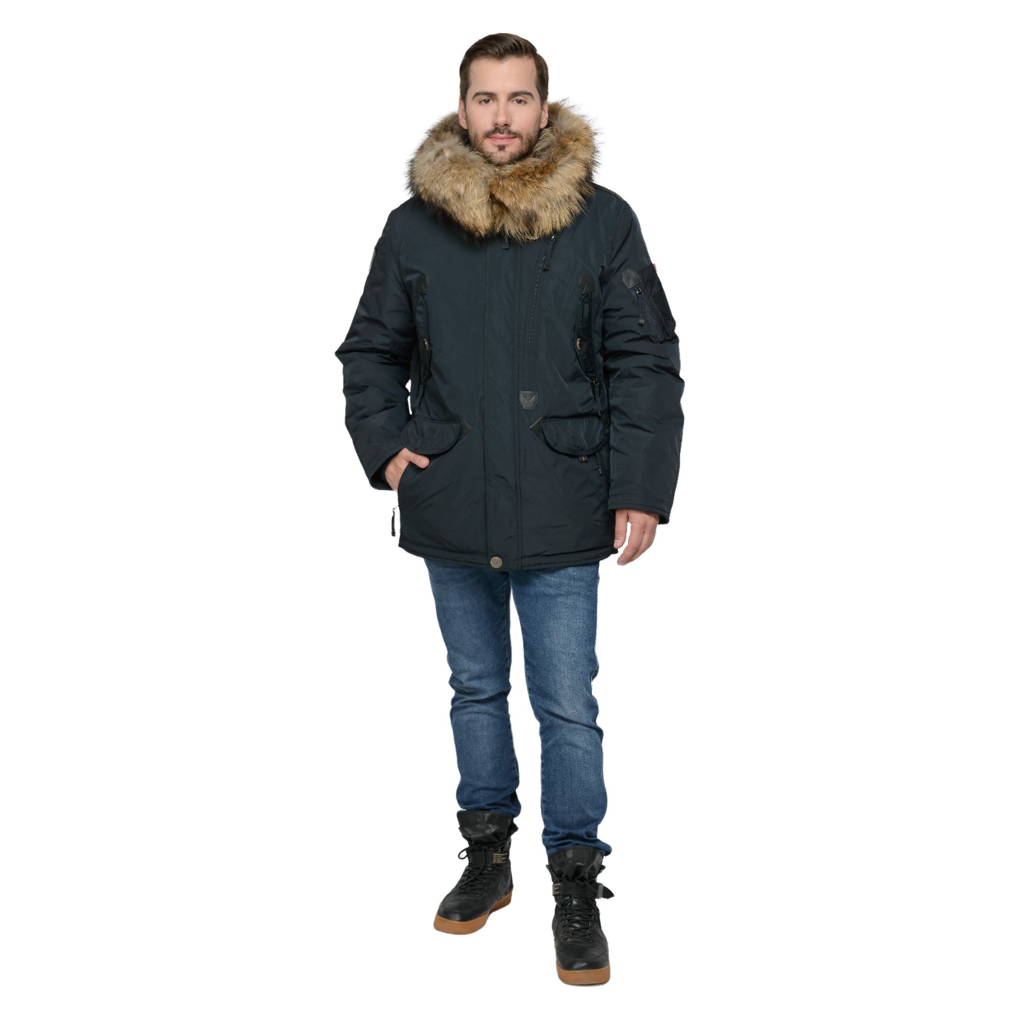 - Объёмный капюшон с отстёгивающейся опушкой из натурального меха